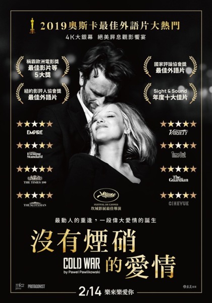 奧斯卡最佳外語片得主《依達的抉擇》導演帕威.帕利科斯基作品,榮獲71屆坎城最佳導演獎,橫掃歐洲電影獎最佳影片、最佳導演、最佳女主角、最佳原創劇本、最佳剪輯五大獎,2019奧斯卡最佳外語片大熱門。帕利科斯基以雙親分分合合的故事為靈感,跨越四國拍攝,創作出一部優雅浪漫、又具時代魔力的電影。音樂也是這部電影的重要靈魂,《沒有煙硝的愛情》將民族樂團所採集的在地民謠,改編成三種風格,分為小女孩清唱版、團體表演版、爵士女伶版,隨著主人翁的人生旅程變化樂風,將愛情無法言語的內心世界提昇至另一個境界。歐洲電影獎評審大讚,這部電影極具意義又充滿了情感。創作者以非常敏感的眼光,帶領觀眾穿越時光,將兩人之間異地的隔閡與個性的不完美,訴說得像一首詩一樣。